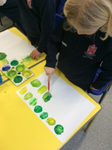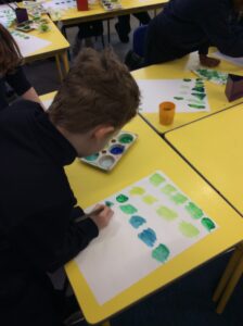 “Today in Art, we have been learning about and practising colour mixing. Our focus was the colour green. We recapped that blue and yellow can be mixed together to make green, and then explored how to change the shade of green. The children experimented with adding different amounts of blue and yellow to create a range of greens, noticing how more of one colour changed the result. We are excited to continue experimenting with other secondary colours and will next explore the effect of adding white and black to change tones and shades. We can’t wait to use all of the skills we are learning in our final art piece.”