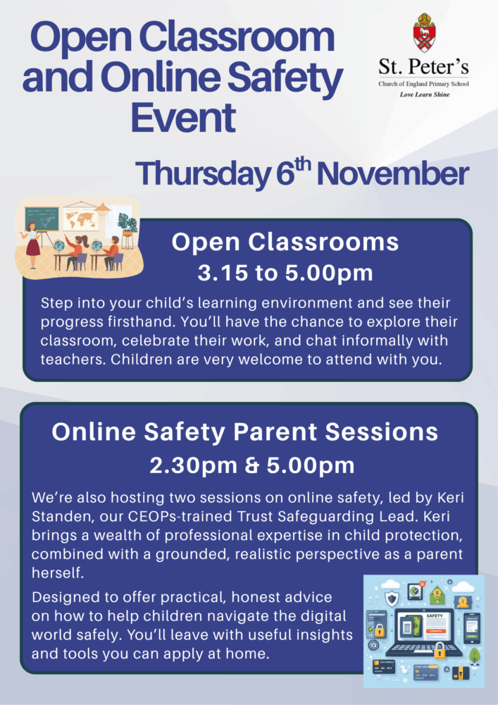 At St Peter’s CE Primary, we know that when families and school work together, children shine. That’s why we’re excited to invite all parents and carers to two important events this term: our Open Classrooms and our Online Safety Parent Talks.