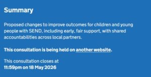 The Government is currently consulting on a set of proposed changes to improve outcomes for children and young people with Special Educational Needs and Disabilities (SEND) across the 0–25 system. These proposals aim to ensure that support is early, local and fair, grounded in strong evidence, and shared across local partners so that every child receives the help they need to thrive.