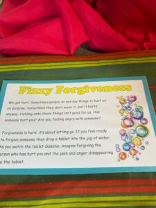 Children dropped a tablet into water and watched it dissolve—symbolising letting go of mistakes, hurt or things they wanted to move on from.